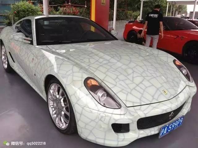 车牌和车型很配,这辆法拉利的裂纹不是贴纸,也不是烧出来的,车身是冰玉色漆底。为什么用玉器颜色底?因为在源远流长的中华传统文化中,玉有着特殊的寓意和价值,象征着财富和身份,俗话说:黄金有价玉无价,况且玉也被人视为君子的象征!