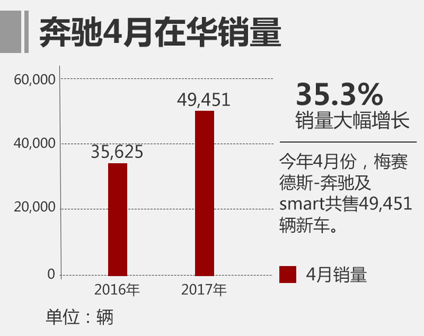 2016年,奔驰重新斩获全球豪华车销量冠军。进入2017年,奔驰全球销量继续保持增长,中国市场也频传捷报。网通社从梅赛德斯-奔驰官方获悉,奔驰已经连续50个月在华实现销量正向增长,其中4月份销量(含smart)达到49,451辆,同比增长高达35.3%。