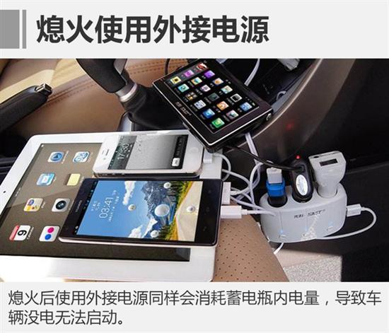 熄火状态下使用外接电源设备。外接电源设备诸如车用吸尘机、便携式充气泵等,切忌不要在车辆熄火状态下使用。由于这些设备的功率都比较大,在熄火状态下长时间使用很容易耗完蓄电池内的存电,从而影响你车辆的正常启动。此外,类似这样的“快速耗电”,对蓄电池本身也有不小的伤害。