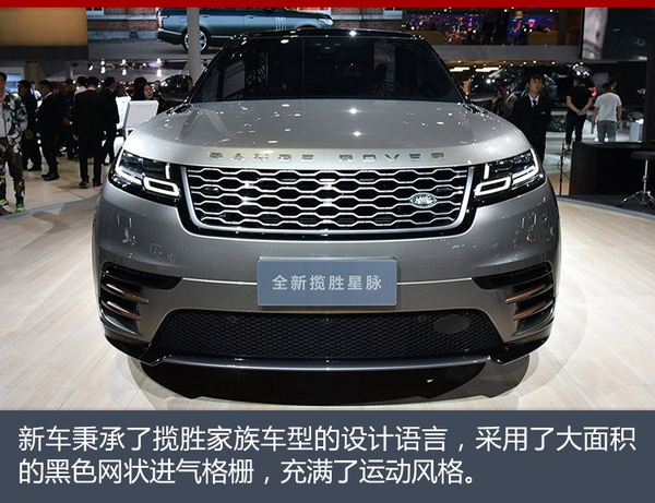 路虎揽胜星脉秉承了揽胜家族车型的设计语言,前脸采用了大面积的黑色网状进气格栅,全系标配包覆式 LED 前大灯,灯组内经过熏黑处理。新车的前保险杠设计也与目前的家族车型不同,尤其两侧进气口采用了“C”字形造型,而前保险杠下方大面积的进气口设计也再次展现出新车浓郁的运动风格。