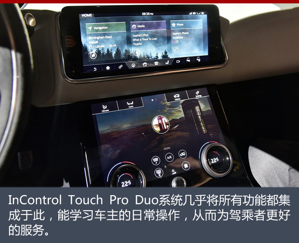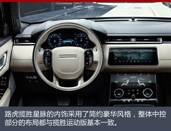 内饰方面,路虎揽胜星脉内饰与外观设计形成了强烈的反差,整个采用简约豪华风格。新车配备了全液晶仪表盘,同时搭载了上下两块10英寸中控屏,搭配实体旋钮,共同构成了InControl Touch Pro Duo系统(智能驭领双屏尊享触控信息娱乐系统)。这套系统可记录车主的日常操作来学习车主的使用习惯,并通过数据判断车主的需求,随时为车主提供信息服务。