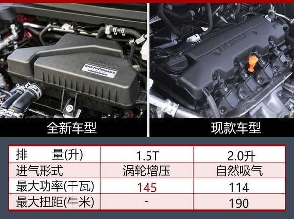 全新CR-V将搭载1.5T发动机,最大功率145千瓦,匹配一款CVT变速箱。现款车型搭载的是2.0升自然吸气发动机,最大功率114千瓦。通过对比后发现,全新车型换搭的1.5T发动机虽然排量降低,但最大功率却大幅提升,同时也将拥有更为优异的燃油经济性。(图/文 网通社 石瑞)