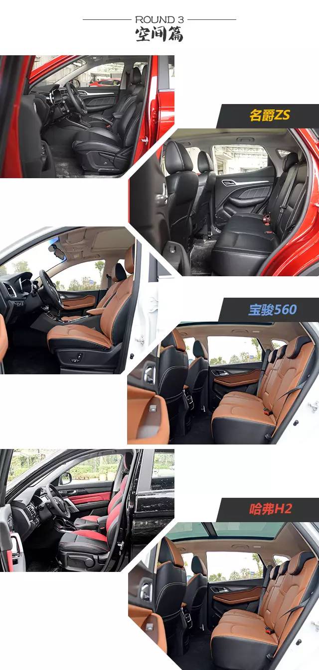 正如前文所说,宝骏560由于尺寸的原因,在乘坐空间方面以压倒性的优势领先,并且它的第二排座椅还支持角度调节,这一点560做的非常到位;MG ZS的座椅更偏向动感,坐垫支撑性较好,有一定运动性;哈弗H2的的坐垫填充很厚实,有种坐沙发的感觉。综合来说这一轮肯定是560胜出。