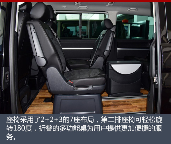 虽然T6迈特威PanAmericana探索版是一款偏于越野性能的MPV车型,但新车内饰的设计依旧十分精致,主打高端商务风格。座椅采用了2+2+3的7座布局,第二排座椅可轻松旋转180度并与第三排形成一个面对面的会议空间,车内还设有一个小型的会议桌,并配备了杯托和储物盒,在不需要的时候可以收起,不影响乘坐空间。