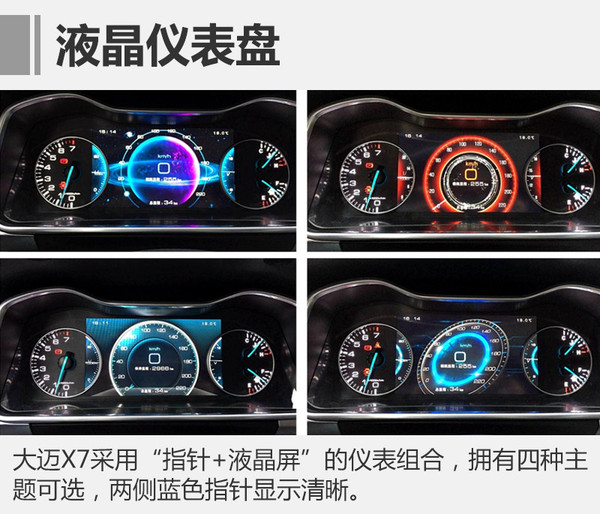 此外,大迈X7仪表盘采用了“机械指针+液晶屏”组合方式,并提供4种主题可选。同时,液晶屏内部采用虚拟指针与数字相结合的显示方式,可显示车速、油耗、里程数、电压等行车信息,且支持导航3D指示等功能。