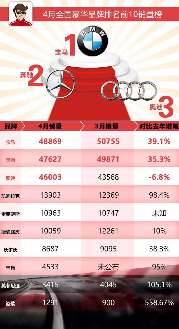 回归正题。先来看看4月份国内豪华品牌的销量情况: