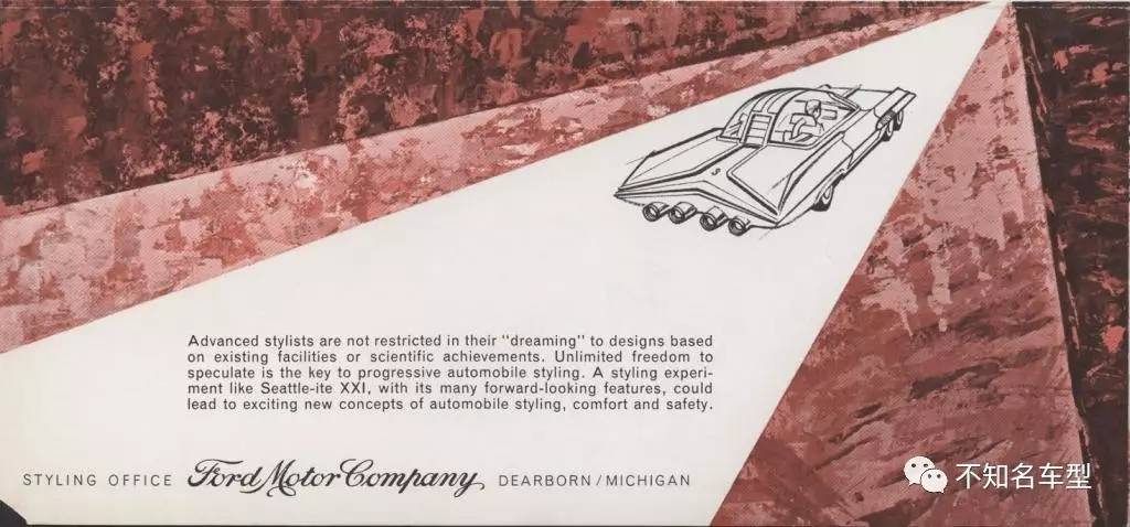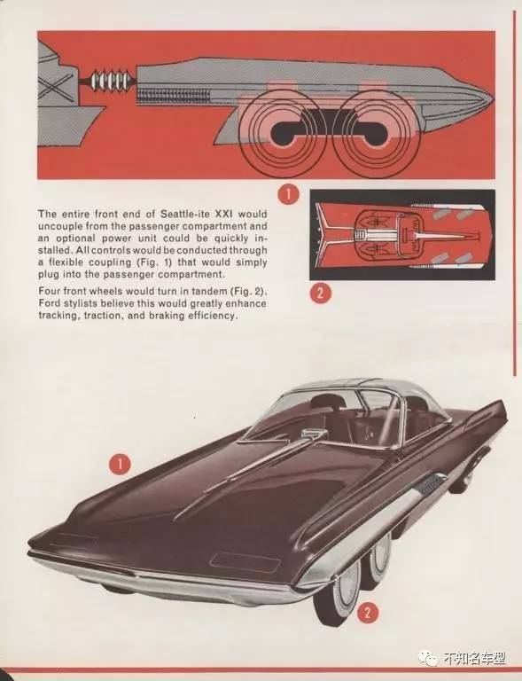 1962 Ford Seattle-ite XXI概念车是一个非常大胆未来且启发性的概念车项目。由Ford Advanced Styling Studio设计师Alex Tremulis主导的模型概念车于1962年4月20日在西雅图世界博览会上的福特展台上展出。驾驶舱几乎处在全封闭的玻璃罩中,车尾下方的四管大型排气管看起来更像飞机推进器。