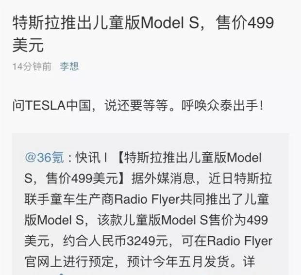 特斯拉也和玩具车公司推出过一款儿童车,最低售价 499 美元,折合人民币 3200 元左右。要是加上备用电池、定制车牌等等配件的话,这个玩具就要卖到接近 6000 块了。而且只接受美国预定。要不就只能呼吁众泰出手了。