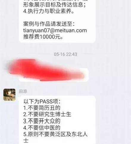 最近有人在微博发出了一张聊天截图,称美团产品运营有如下招聘条件:不要简历丑的、不要研究生博士、不要开大众的、不要信中医的、原则不要黄泛区及东北人士。