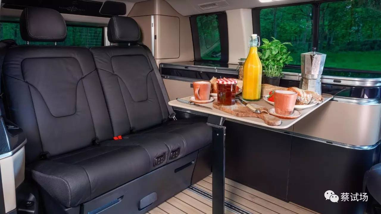 前排座椅可旋转,后排双人座椅可放平作为双人床,顶棚可电动升起容纳另一张双人床。