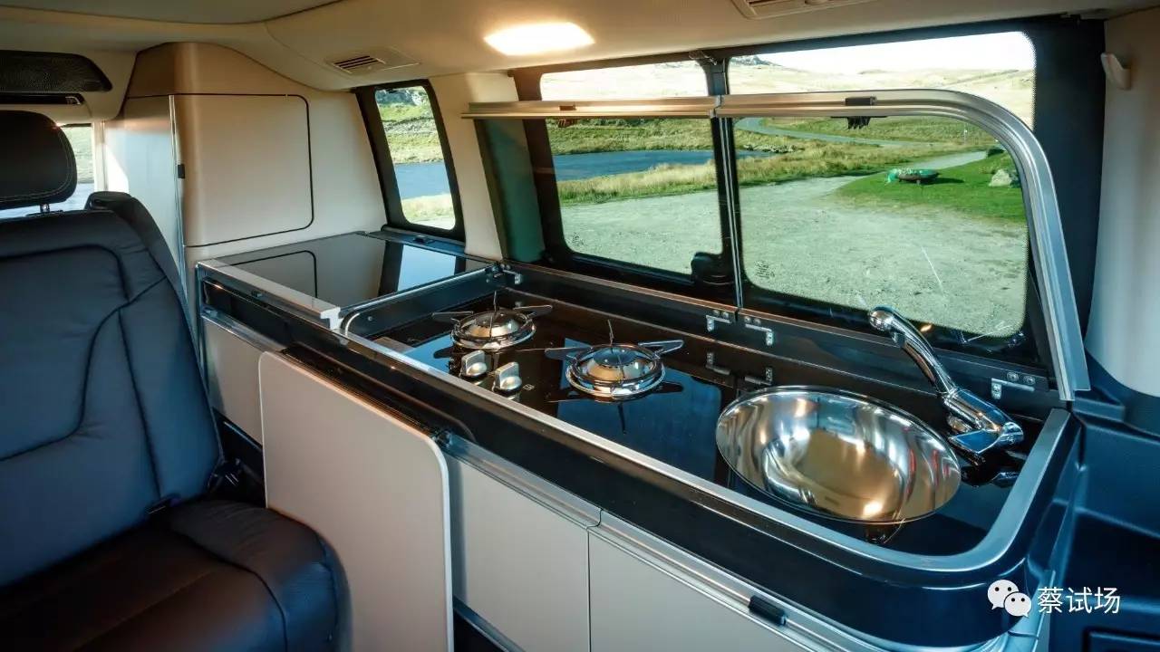 奔驰V级 (配置|询价)马可·波罗(Marco Polo) 露营车基于V级厢式车,配备灶具、冰箱、橱柜、折叠桌、3区空调、木地板和外置水电接口等。