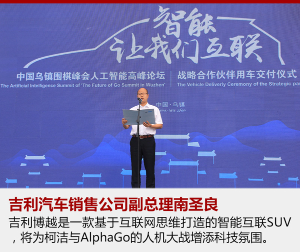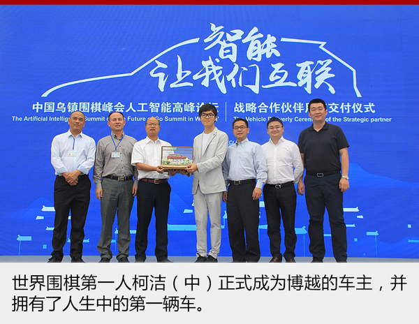 5月19日,“吉利博越中国乌镇围棋峰会人工智能高峰论坛交车仪式”在乌镇互联网国际会展中心隆重举行。网通社从现场发回报道,吉利汽车向人工智能高峰论坛正式交付了13辆配备GNETLINK 3.0技术的博越,并向世界围棋第一人柯洁赠送了一辆白色博越1.8T自动四驱智尊型,助其迎战AlphaGo。