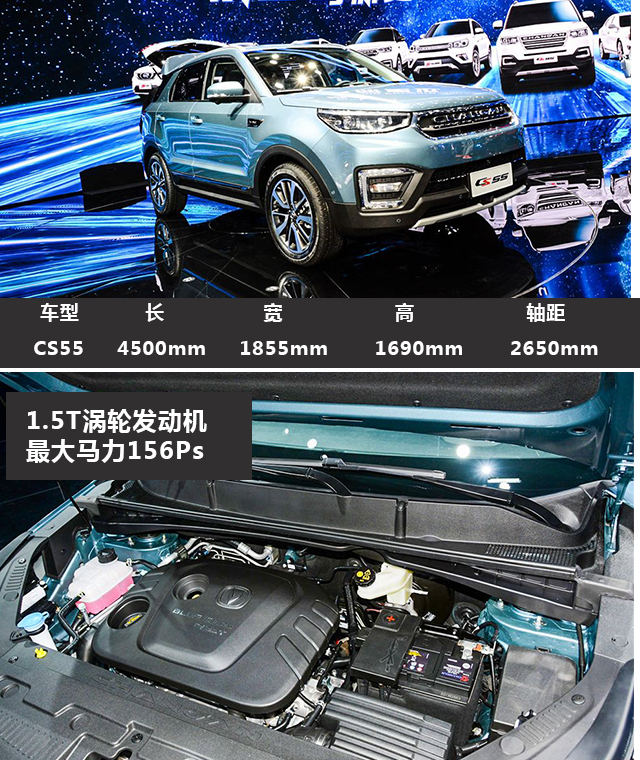 以目前所知道的消息来看,CS55的三围尺寸为4500*1855*1690mm,轴距为2650mm,与长安CS75在紧凑SUV阵型当中形成搭配以面对激烈的市场竞争。与其匹配的是一台1.5T涡轮发动机,最大马力为156Ps,数据相当出色。听说自动挡还会是一台6AT变速箱,以目前长安大规模采用爱信6AT的现状以来,很有可能CS55会搭载。