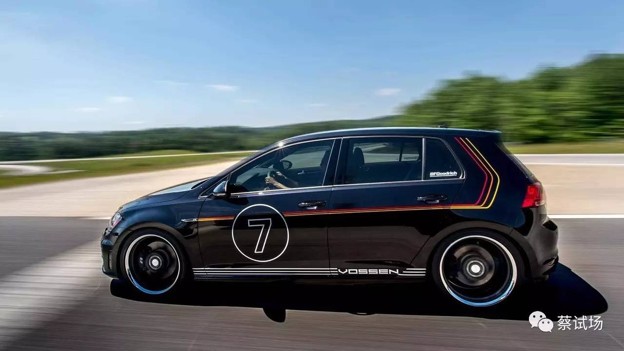 概念车由大众美国打造,基于高尔夫R,车身绘有源自德国国旗的红、橙、黄和白色条纹,搭配Vossen VWS-1银灰双色轮毂和百路驰G FORCE COMP-2 A/2轮胎。底盘更换H&R运动弹簧,车身降低。(Volkswagen、Motor1)