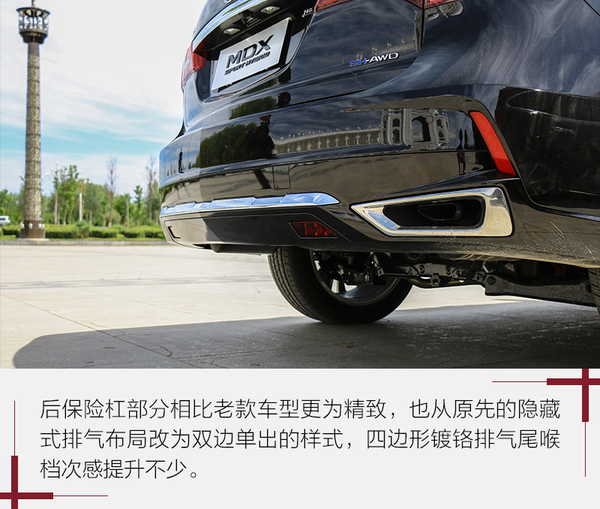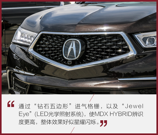 讴歌MDX HYBRID外观有所升级,采用了和CDX类似的最新家族式风格,五边形钻石进气格栅配合全新保险杠设计,前后尾灯进行了小幅微调。前大灯的LED造型和尾部双出的镀铬排气管,使得整车更有特点。