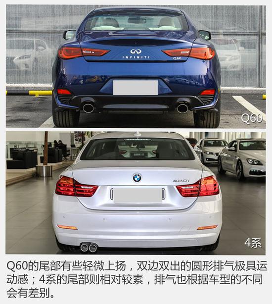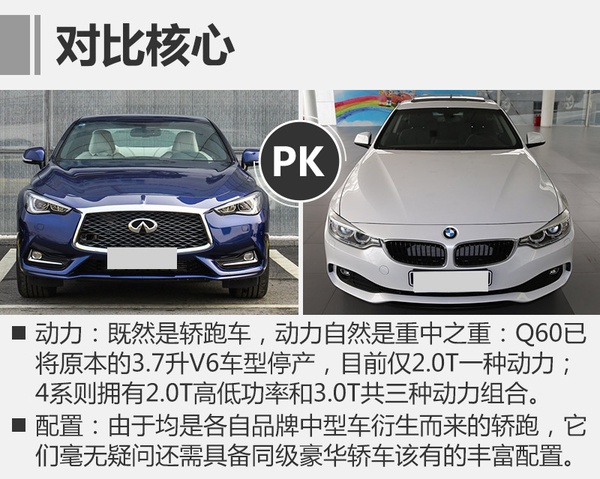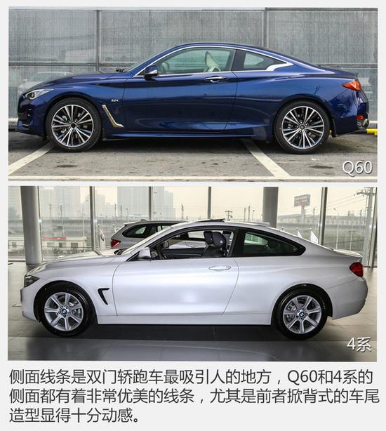 运动轿跑在国内属于消费群体比较有限的一类车型,真正喜欢它的人一定都是死忠粉了,即便后排乘坐空间和装载能力都十分有限,但动感流畅的侧面造型就足以让不少外观控为其买单了。前不久,英菲尼迪全新Q60正式上市,本文将其与该级别较受欢迎的4系进行了对比,看看谁更适合你。
