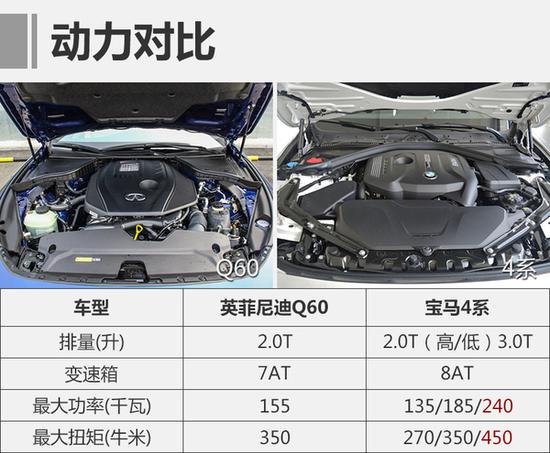 不难看出全新Q60的2.0T发动机略强于宝马4系的2.0T低功率车型,功率与后者的高功率版本仍有差距。另外,宝马4系还有搭载直列六缸发动机的3.0T版本,对于消费者来说,想获得更强大的动力,毫无疑问只能优先考虑宝马440i了。