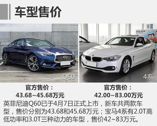 英菲尼迪全新Q60目前仅保留了2.0T一种动力共两款车型,售价分别为43.68万元和45.68万元;宝马4系不仅在动力上拥有2.0T高低功率和3.0T三种动力,更有双门四座(硬顶/敞篷)和四门五座多种车型可供选择,因此售价区间也更为宽泛,为42~83万元。