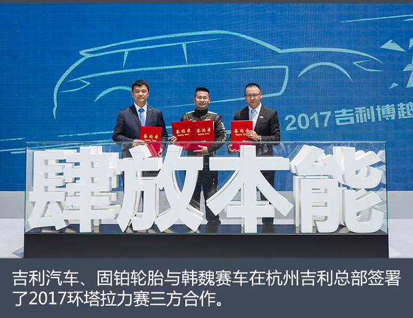 端午假期前夕(5月27日),网通社受邀在吉利汽车的杭州总部一起见证了吉利博越 (配置|询价)2017环塔拉力赛签约暨出征仪式。接下来由三方组成的“吉利汽车固铂轮胎车队”将出征拉力赛,通常长达12天,长约5000公里的越野赛程,向三连冠发起冲击。
