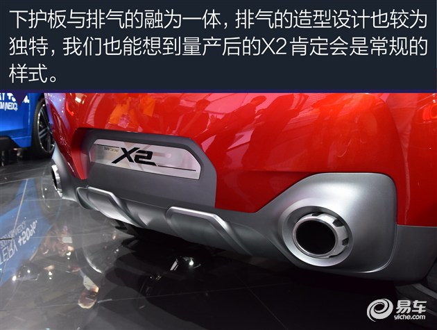 此次亮相的X2概念车已经基本接近最终实际的量产车型,但如果最终与X1相似那么是否会与X1有着很大的重叠?从之前公布一些相关谍照来看,与X1相似已经是没有任何的悬念了,虽然采用了运动的设计风格,但与X4、X6有着一些的差距,我想上市后的X2会更符合年轻人的审美。