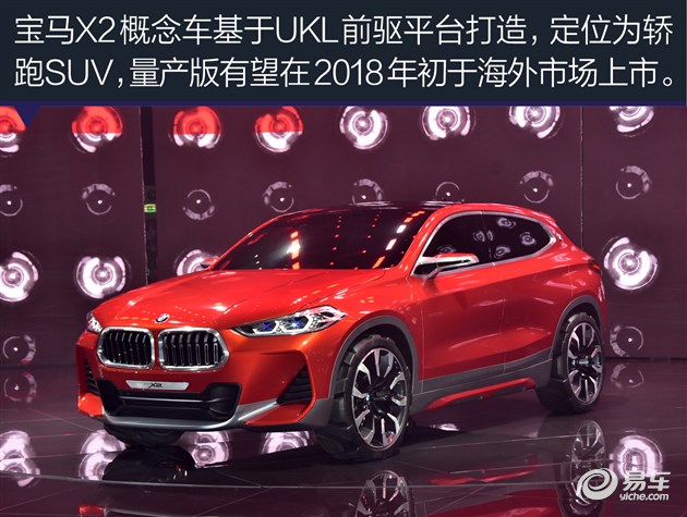 今年宝马X1在国内正式上市不久,很多人就开始想象X2什么时候会与大家见面,在刚刚开幕的巴黎车展上宝马带来了我们万众期待的X2概念车型。宝马X2概念基于UKL前驱平台打造,定位为轿跑SUV,量产版有望于2018年初在海外上市。