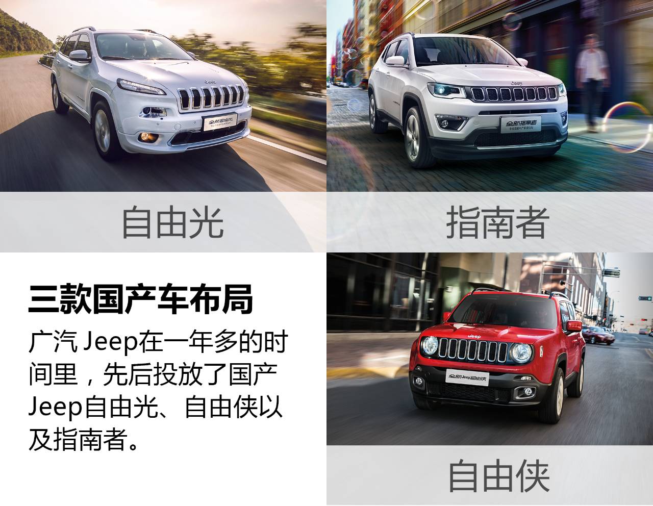 在现在,买车对于普通家庭而言并非难事。根据数据显示中国中产家庭的数量达到上亿人口规模,出行车辆对于他们来说,已经不再是以往两点一线的代步工具,而是升级为全场景通用性以及生活方式迭代变化的载体,更成为带来“5+2+7”模式里更为丰富而鲜活生活的伙伴。5天日常通勤安全而舒适的驾乘,2天周末与7天小长假里带上家人和朋友,来一场说走就走的旅行,去往心中的“诗和远方”。 Jeep国产三驾马车,准确把握住了消费升级时代消费者对于安全感和品质感的双重需求,使其迅速上位,成为细分市场的新爆款。