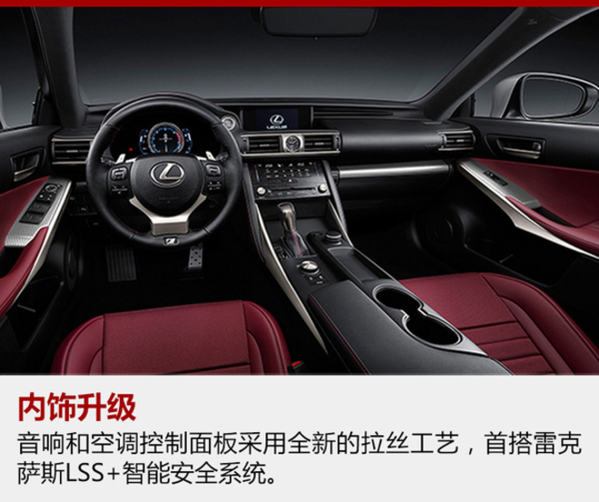 雷克萨斯新款IS车型的内饰也进行了升级,音响和空调控制面板采用全新的拉丝工艺。豪华版车型的中央显示屏由7英寸升级至10.3英寸,配备15支扬声器的Mark Levinson®高级音响系统。同时,新车还首次搭载了雷克萨斯LSS+智能安全系统,安全性提升。此外,新款IS提供“酒堡色”和“伯爵棕”两种内饰配色供用户选择。