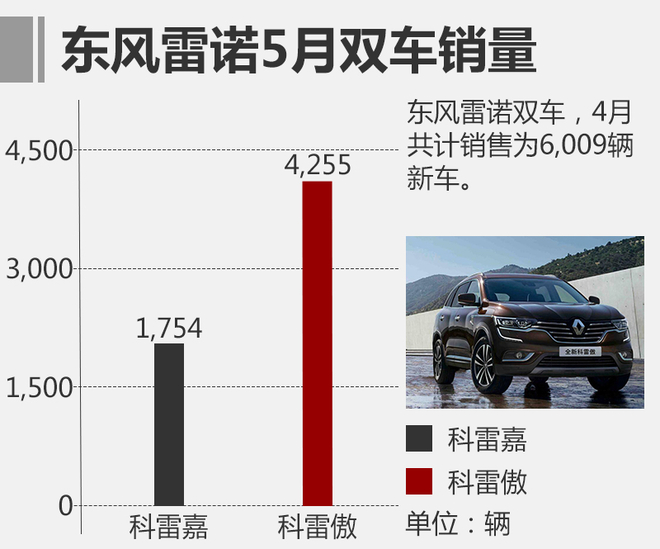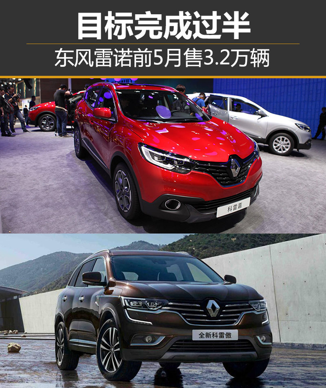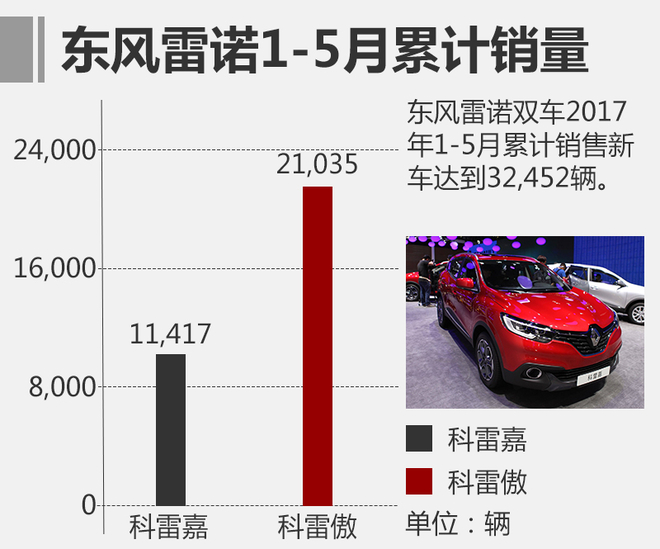 2017年1-5月,东风雷诺两款SUV总销量为32,452辆,全新一代科雷傲和科雷嘉的销量分别为21,035辆和11,417辆。