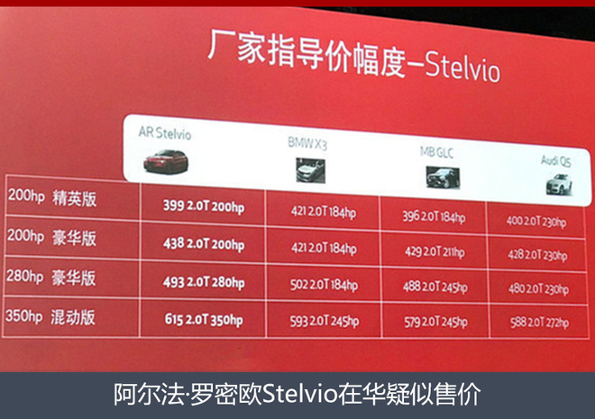 根据此前的消息,Stelvio的疑似售价区间为39.9-61.5万元,与奥迪Q5、奔驰GLC及宝马X3等同级别豪华中型SUV的国产车型相比价格非常接近。作为完全进口的阿尔法·罗密欧Stelvio,入华后的起售价有望会比这些同级别国产竞品车型还要低,这也为品牌进入中国市场奠定了良好的基础。
