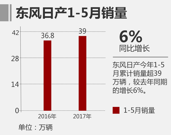 伴随着“YOUNG NISSAN 3.0”时代的来临,东风日产进入了全新发展阶段。2017年4月企业终端销量为77,174辆(含进口车),同比增长 5.4%。进入5月,企业继续保持稳定增长。东风日产乘用车公司市场销售总部副总部长陈昊在与网通社沟通时表示:“东风日产前5月零售销量超过39万辆,同比增长6%。”