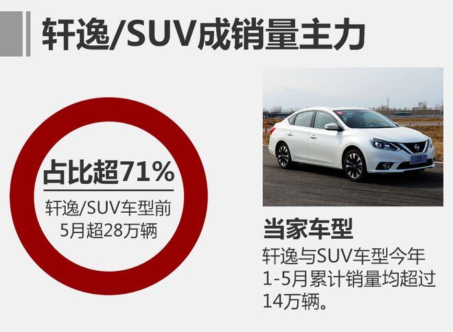 其他产品方面,中型轿车天籁前五月销量超过4万辆;紧凑型SUV今年1-5月更是实现了38.1%的高速增长。
