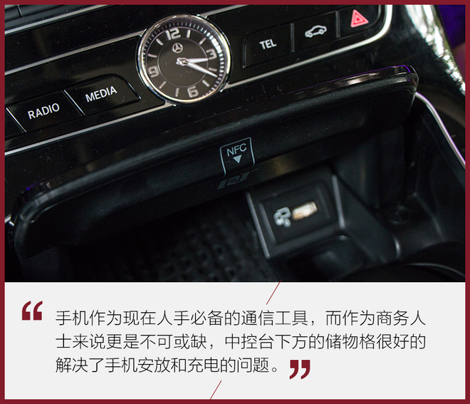 时代在更新,技术在更新,但是手机电池技术一直没有更新,相信手机电池没电不仅仅只是小编我的感想。新E级在中央储物区处专门设置了一块用于给手机充电的地方,不过这个功能仅限于支持无线充电,不支持的只能乖乖插线充电了,小编用的苹果手机,放进去就默认弹出了Wallet。