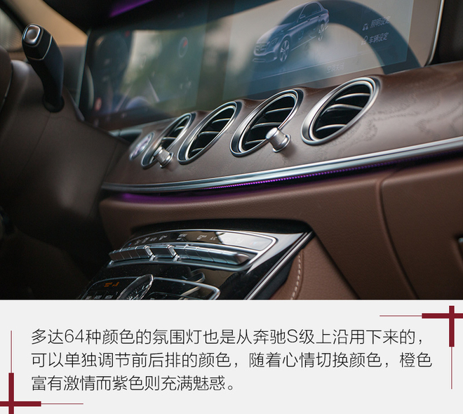 拉开车门,落座其中。对于奔驰E级的内饰设计,我是完全没有免疫力的,从设计到用料,再到科技配置,它的表现已经跨越了同级别的水平,和旗舰的S级不相上下了。坐在它的座舱内,不管是前排,还是后排,你都可以感受到奔驰那种特有的豪华感,对于车内氛围的营造奔驰一直是这个行业的佼佼者。