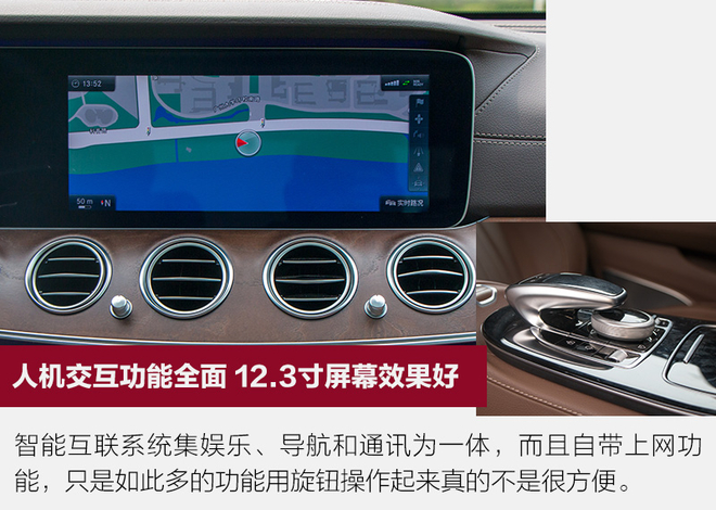 更新后的驾驶室管理和数据系统以及联网功能 (COMAND Online) 集信息娱乐、导航和通信系统于一身。就目前我开过的车来说,我会使用手机导航来代替车载的导航系统,但是就这台车而言,我会更加偏向于用车载的导航,原因有二:1.拒绝不了的大屏诱惑;2.同步更新实时路况,还有交通指示牌提示。