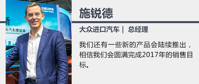 目前大众进口车在整个中国进口车市场上占据了5%左右的市场份额,一方面在守住这5%市场份额的同时也将进一步完善产品布局。大众进口今年1-5月份的整体销售表现稳中有升。对于今年的市场预期施锐德表示:“下半年, 我们还将推出更多的新产品,不断丰富我们的产品系列。对于下半年的销售,我们充满信心。”(图/文 网通社 王静亚)