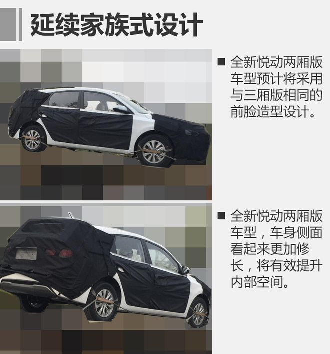 从谍照透露出的细节以及轮廓来看,全新悦动两厢版车型延续了北京现代的家族式设计风格。这款车基于全新悦动三厢版车型打造,前脸造型预计与三厢版差别不大。新车整体造型采用旅行车的设计样式,对内部空间将有明显提升。