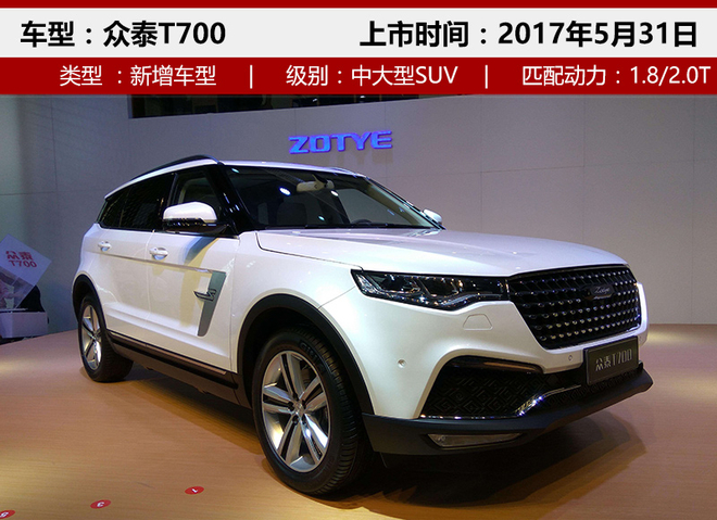 动力方面,众泰T700先期搭载1.8T和两款2.0T发动机,其中1.8T发动机的最大功率为130千瓦,峰值扭矩245牛米,与之匹配的是5速手动或6速双离合变速箱;2.0T发动机最大功率140千瓦,峰值扭矩250牛米,与之匹配的是6速双离合变速箱。