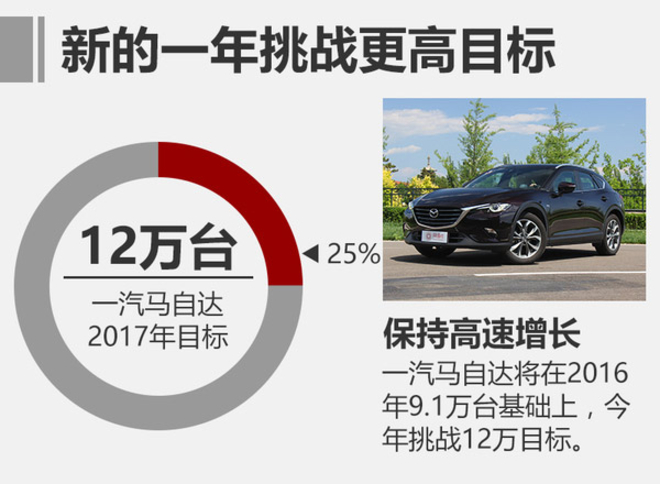 在产品层面,马自达在2016年推出了新阿特兹和CX-4两款新车,且全部为一汽马自达渠道。新产品的投放,加之对产品的重新梳理,2017年1月份以来,一汽马自达一直保持高速增长,并且将在品牌特点、细分市场、消费者体验三个方面实现“向上”,挑战12万辆的全新年销目标。
