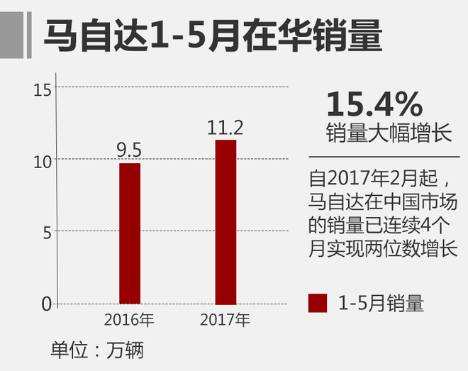 网通社从马自达官方获悉,2017年1-5月份,马自达在中国市场中的累计销量(零售)达到了112,367辆,同比增长15.4%。其中,5月份销量达到25,093辆,创5月单月销量历史最高纪录。