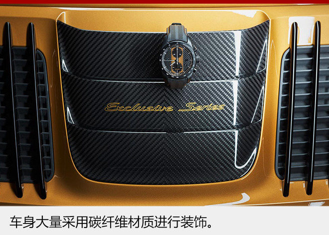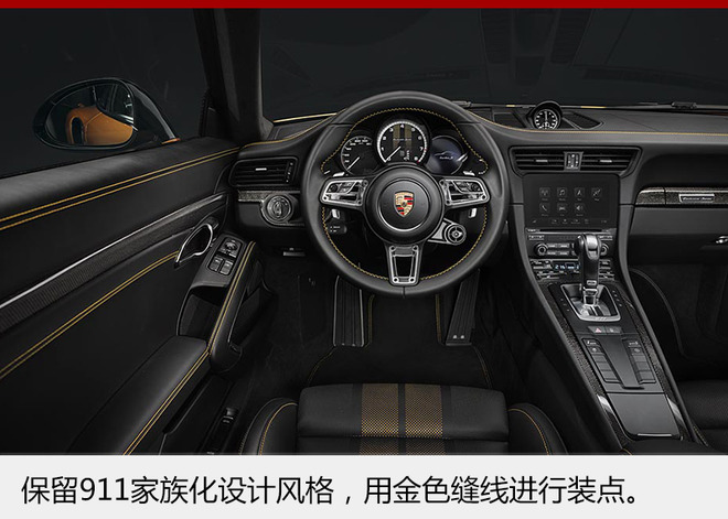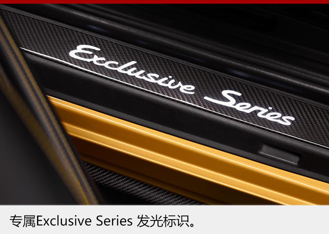 内饰方面,保时捷911 Turbo S Exclusive Series同样采用纯手工打造。整体在延续911系列车型的设计风格外,还用金色缝线进行大量装饰。其中,18向可调节运动座椅配有两层穿孔皮革,头枕上接缝与Turbo S字样同样用金色缝线缝制。车顶内衬采用带金黄色双条纹的Alcantara 面料,而碳纤维内饰组件的装饰条上还配有上等铜线。车门槛护板表面也采用了碳纤维材质,并刻有“Exclusive Series ”的发光标识。