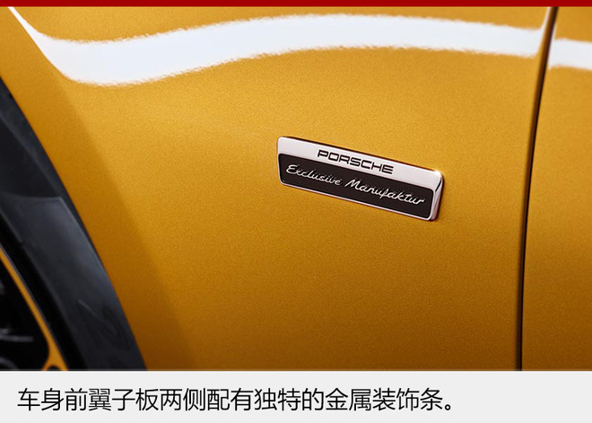 细节方面,新车车身采用璀璨金金属漆进行喷涂。配备中央锁止功能的20寸轮辋同样用璀璨金进行装点。前翼子板两侧Porsche Exclusive Manufaktur的装饰条,更能增强整车可辨识度。此外,新车还在Turbo空气运动套件、后裙板、进气口等用碳纤维材质进行装点,整体配色更显示出壕华风范。