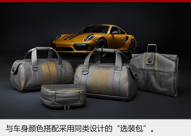 动力方面,新车将搭载一台配有专属动力套件的3.8升双涡轮增压发动机,最大功率为446千瓦,峰值扭矩可达到750牛米。新车零到百公里加速时间仅为2.9秒,还可在9.6秒时间完成200公里每小时加速,最高时速可达到330公里每小时。除此之外,保时捷911 Turbo S Exclusive Series还可选装一套五件款真皮行李箱包组合,整体颜色搭配与新车相互配套。不过,想要拥有这套装备,还需额外花费99,600元。(图/文 网通社 马云龙)