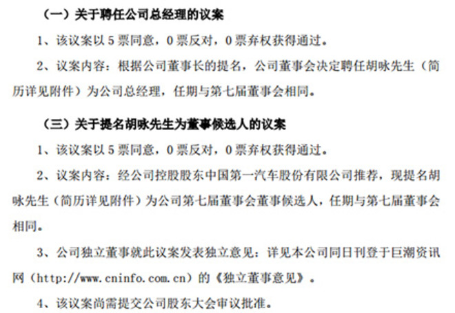 一汽轿车股份有限公司对外董事会会议决议公告。网通社从一汽轿车官方获悉,公司董事会决定聘任胡咏先生为公司总经理,聘任张加奕先生为公司副总经理,任期与第七届董事会相同。同时,董事会提名胡咏先生和王国强先生为董事候选人。