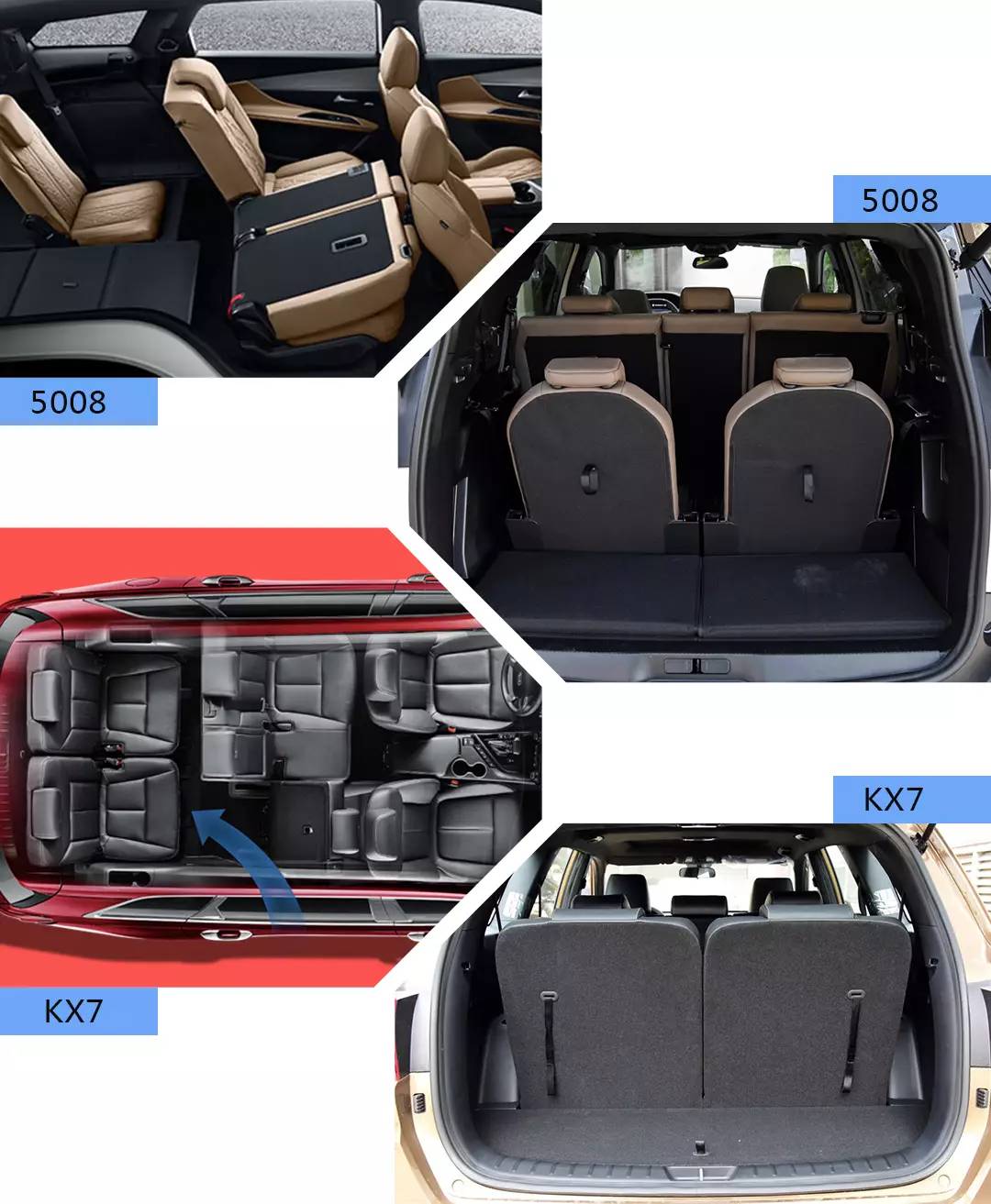虽然KX7标榜自己是中型SUV,但其2700mm的轴距有点名不副实。相比于KX7而言,标致5008长达2840mm的轴距才可以说自己是一款真正的中型SUV。比较它们整体的空间表现,虽然第三排座椅放好之后后备厢的空间确实所剩不多,但很明显标致5008的车内空间更胜一筹;KX7的第三排空间则略显局促。