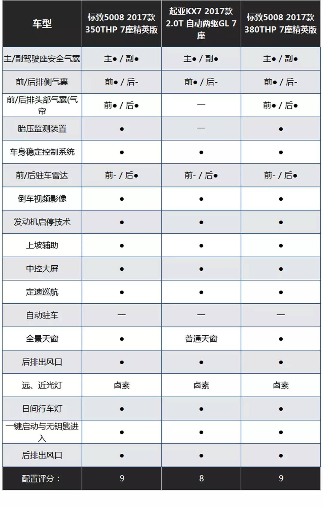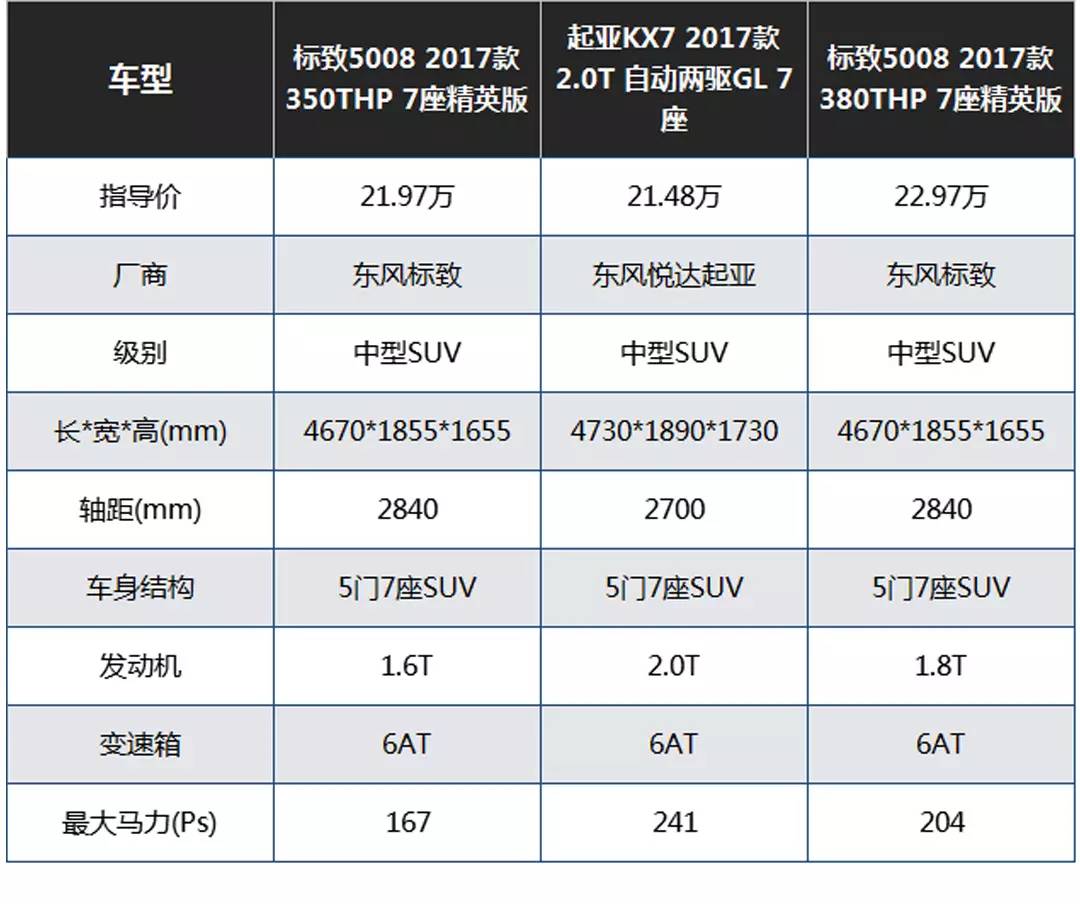 预算有限对于配置有一定需求那么教授建议你购买标致5008的1.6T7座精英版本,其比1.8T车型最大的差别应该就是发动机的不同了。假如你对动力与配置同样要求很高,教授则建议购买标致2017款 380THP 7座精英版与起亚KX7 2017款 2.0T 自动两驱GL 7座这两款车型,动力与配置明显更好更实用性。