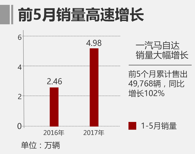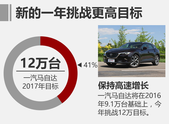 一汽马自达将2017年定为向上的第一年,将从品牌特点、细分市场以及消费体验三个层面向上。并在销量明显提升的基础上,将今年的目标定为12万台。从前5个月的销量来看,已经完成目标的41.5%。由此可见,今年12万台的销量目标也是不难完成的。(图/文 网通社 张雪莲)