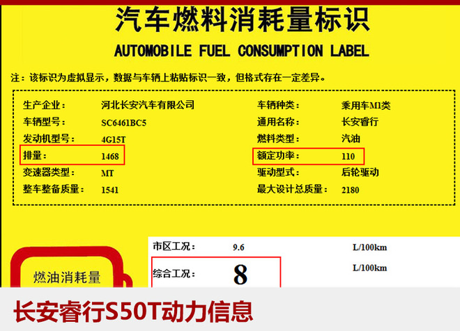 国家工信部显示,长安睿行S50T将搭载一台代号为4G15T的1.5T涡轮增压发动机,额定功率为110千瓦,传动方面将匹配一台6速手动变速箱。此外,新车百公里油耗为8升。