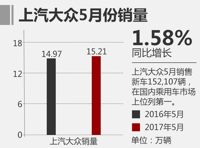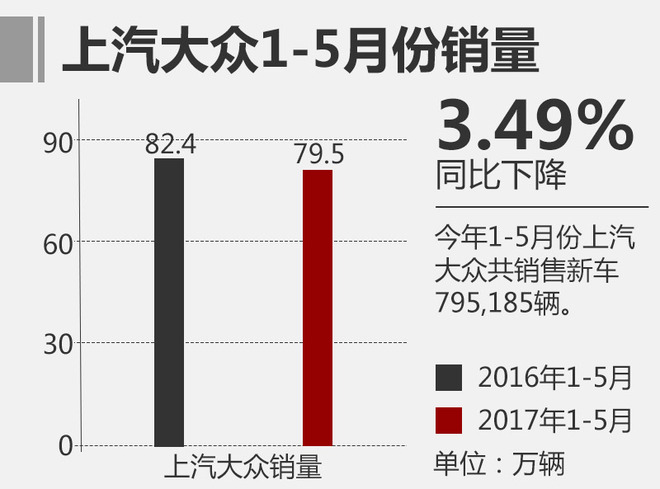从官方公布的最新销量数据来看,上汽大众5月份重回国内乘用车市场排名第一的位置,单月销量达到152,107辆,相比去年同期的149,736辆,销量增长1.58%;由于受前两个销量下跌的趋势影响,前5月累计销量没有实现如期的增长,共销售新车795,185辆,相比去年同期下降3.49%。