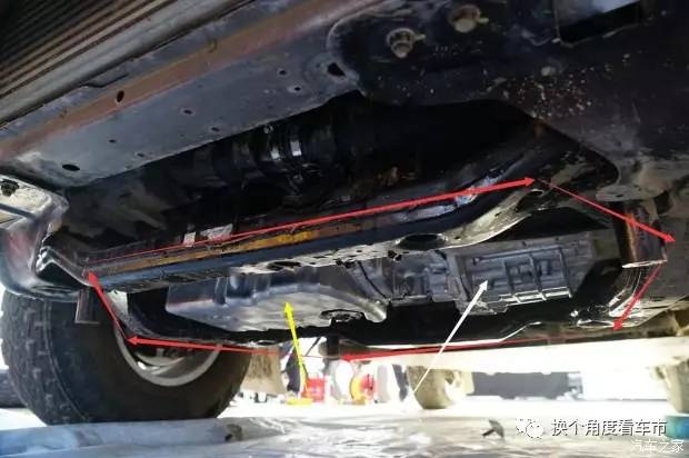 很明显,如果没有护板保护,框型前副车架(红色箭头)前部将首当其冲遭到碎石等异物的冲击。而铝合金油底壳(黄色箭头)和铝合金6前速湿式双离合变速器壳体被击碎的可能性直线上升。