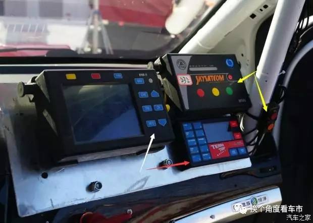 赛事组委会强制要求每台参赛车辆都要加装实时赛道导航系统(白色箭头),应急呼救以及车辆状态标定系统附带延长控制面板(黄色箭头)。而车队也会为赛车额外配置更精准的行驶里程记录仪(红色箭头)。
